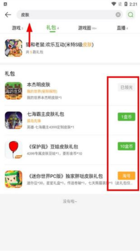 3.或者在【礼包】页面花费盒币购买,当然也可以通过淘号,抢号等方式免费获得皮肤,不过礼包的数量是有限的,所以这里的皮肤也是属于先到先得。