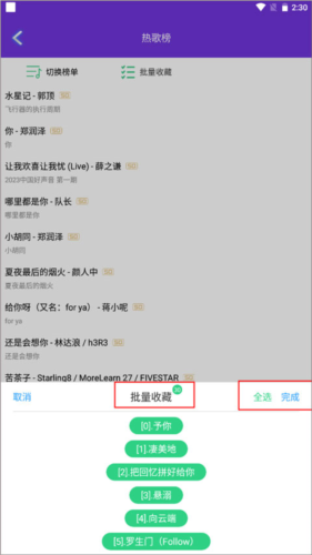 3、选择你想要收藏的歌曲,然后点击右边的完成按钮。