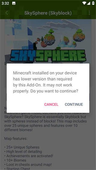 5、在此界面点击CONTINUE,点击完成导入了,随后会自动跳转至我的世界游戏,玩家就可以上线畅玩啦!