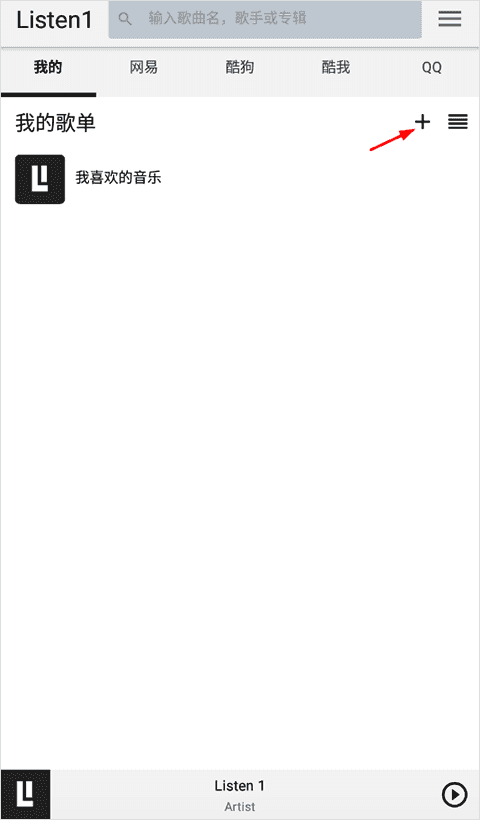 1、首先打开listen1音乐播放器手机版,在我的一栏中找到歌单旁边这个小加号,点开;