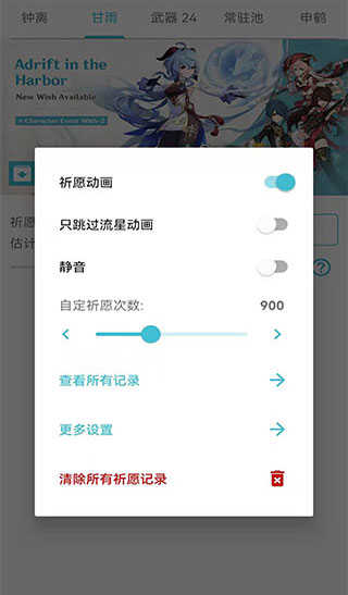 3、在设置页面,可以调整动画、静音和祈愿次数等。