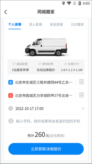 2、直接就可以按照自己的搬家需求选择进入,填写起点和送达地点的信息,选择预约搬家的时间,最后输入手机号即可获得报价。