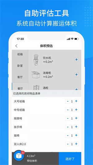 4、满额赠礼:跨市搬家满额即赠精美纸箱,免费送货上门,30秒内获取搬家报价,报价明细清晰明了。