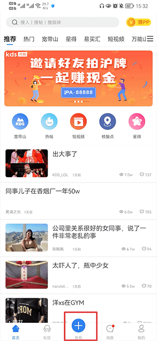 1、打开kds宽带山app,在首页中点击下方栏目中的发布