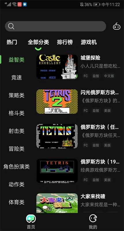 2、以全部分类为例,可以看到益智类、竞速、策略类、格斗类、射击类等丰富的游戏类型,选择想玩的游戏就可以了。
