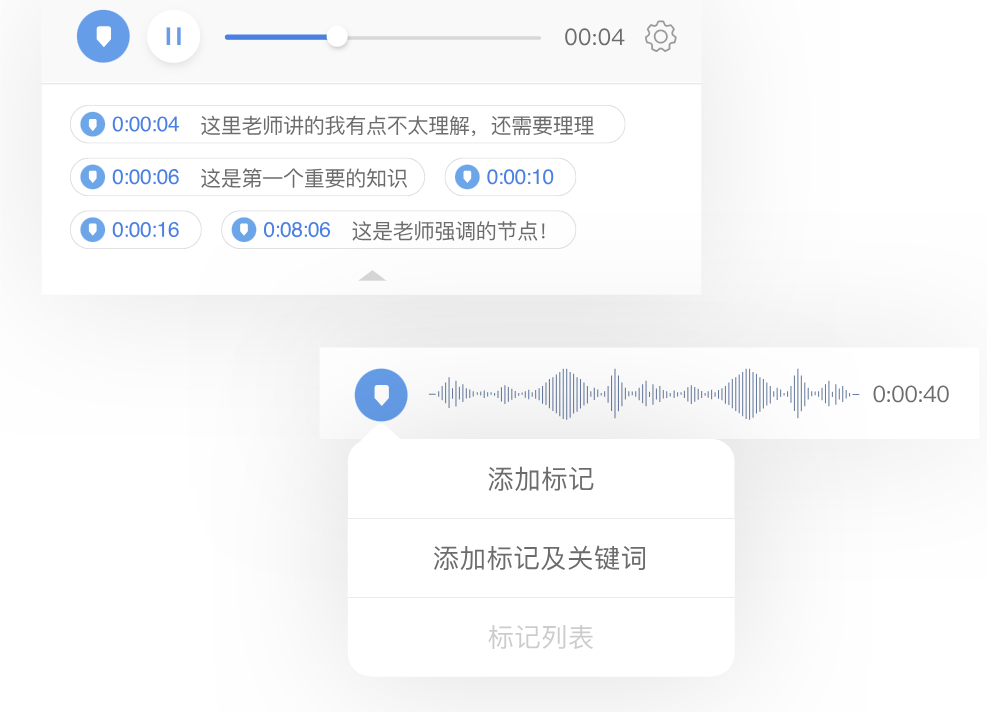 支持超长录音,边录边记,让您在课堂上、会议中再也不用担心忘记重点;并且可以给录音添加重点标记,会后整理,哪里重要听哪里,帮您直抓重点。