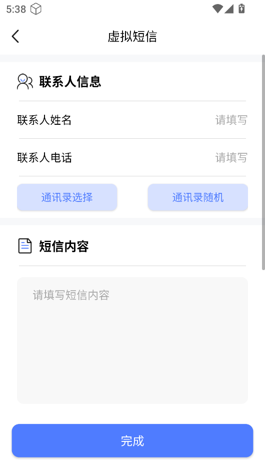 5、虚拟短信功能,输入联系人姓名、电话、短信内容等后点击完成即可。