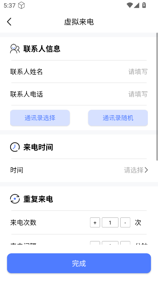 4、点击进入虚拟来电,按需要设置联系人信息、来电时间等点击完成即可。