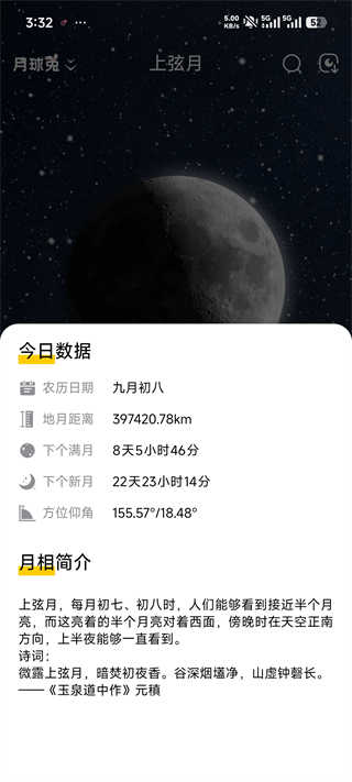 想知道每一天月亮的姿态吗,切换日期即可拥有!从月升月落时间到地月距离、从方位角到农历日期...还有你所不知道的诗意月相名,月亮美图更可一键保存!