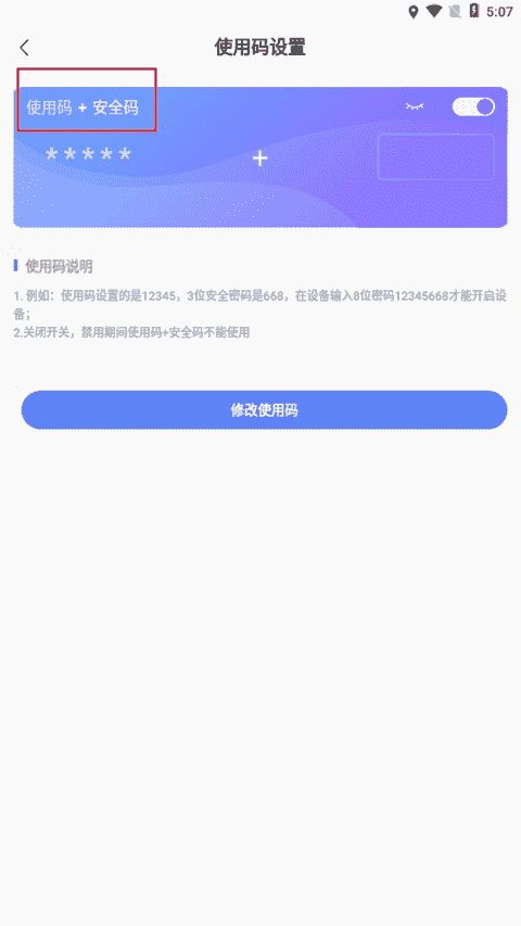 使用码设置需要使用码加安全码两部分组成,用户可以自行设置。