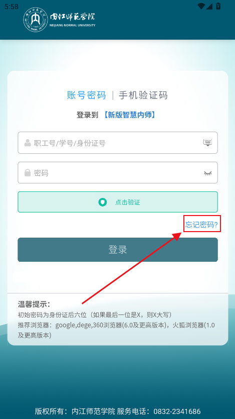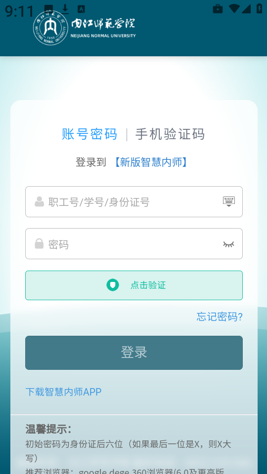 1、在东坡下载智慧内师app,进入到登录页,点击蓝色字体“忘记密码”