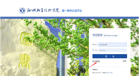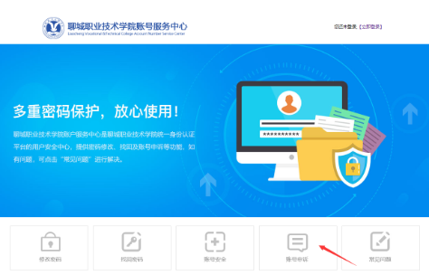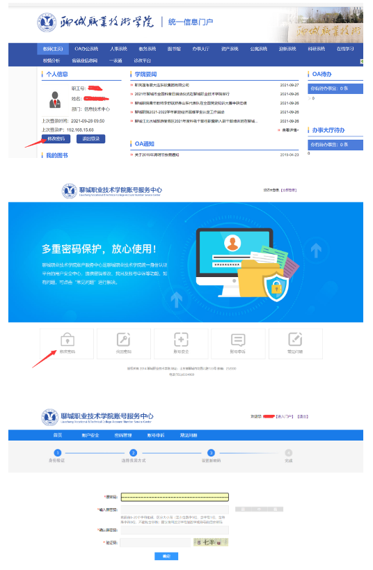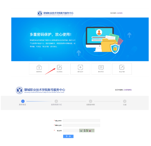 打开http://portal.lcvtc.edu.cn(注:需用PC打开,手机暂不支持),点击“忘记密码”进入安全中心,如下图