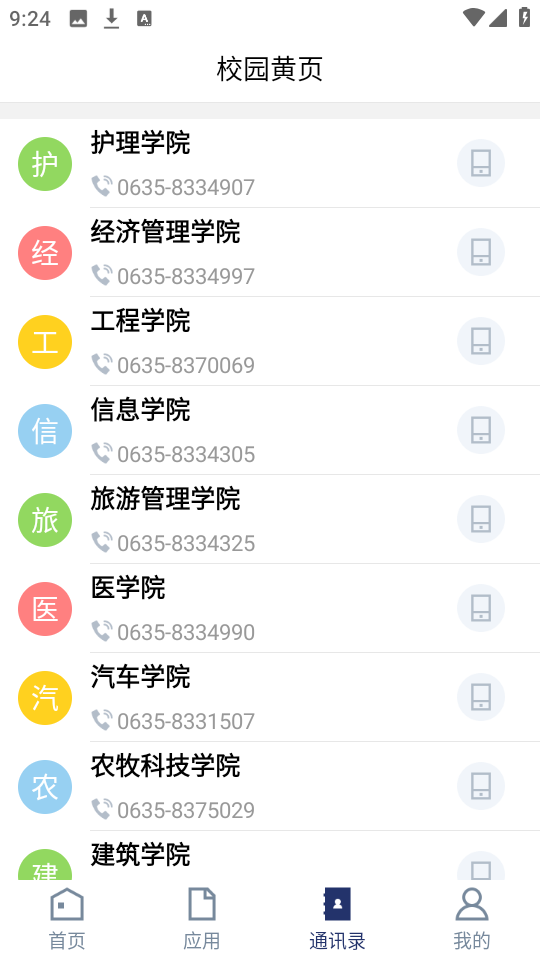 2、接着点击下方的“通讯录”,可以看到每个学院的通讯信息。