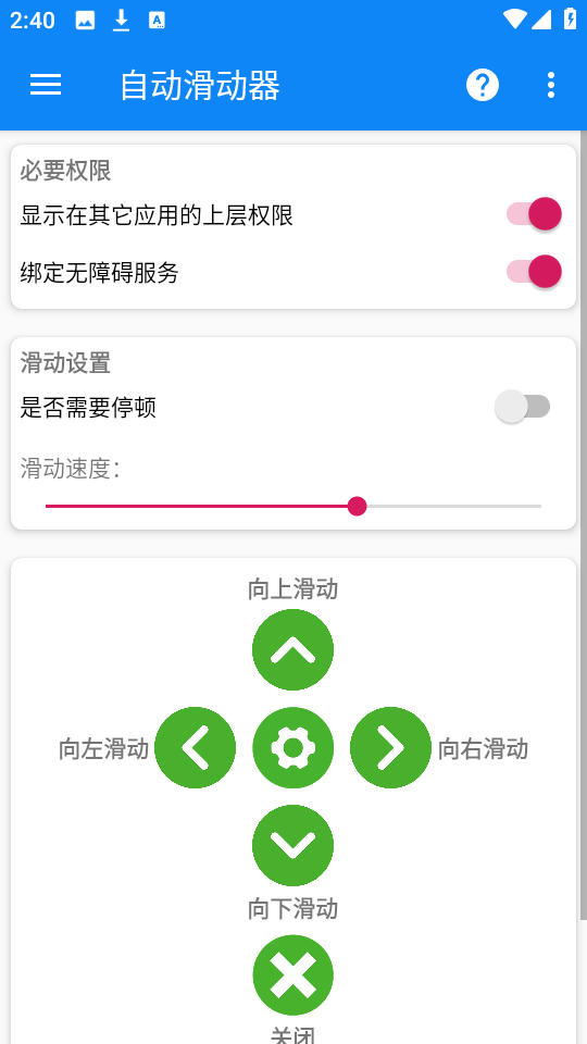 自动滑动器是一款免费自动化工具,软件内主打自动滑动操作,能自由设置滑动方向、速度及停顿时间,可以用来刷视频、看小说、抢红包等场景中使用,界面无广告,所有功能免费开放,主要是为了帮助用户减少手动操作,提升使用效率。不管是刷视频,刷小说,刷微博都非常适用,一定程度上可以提高点击效率。使用的过程中没有任何限制,支持用户自由设置各种自动滑动停顿的时间,适用场景广泛。