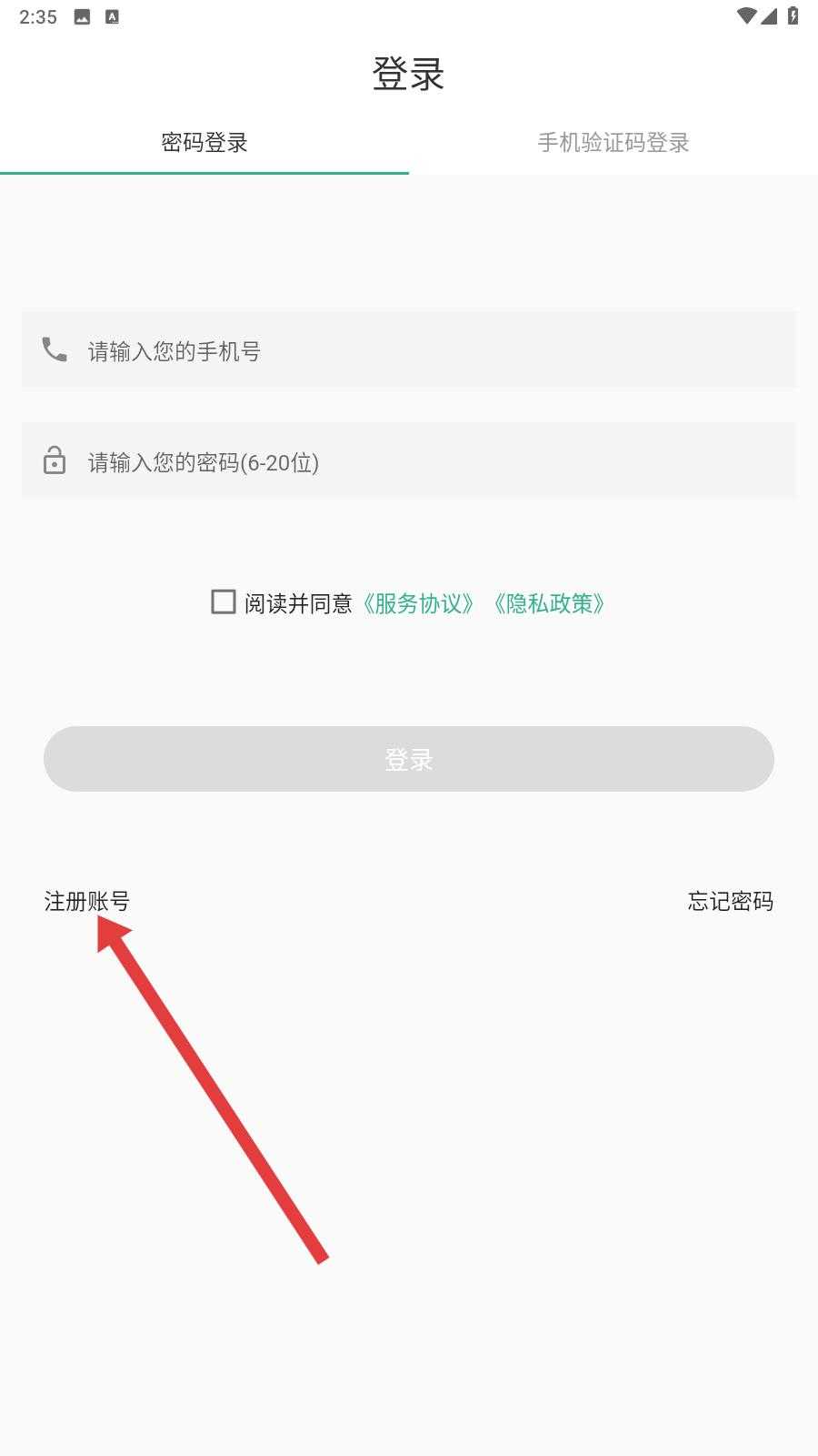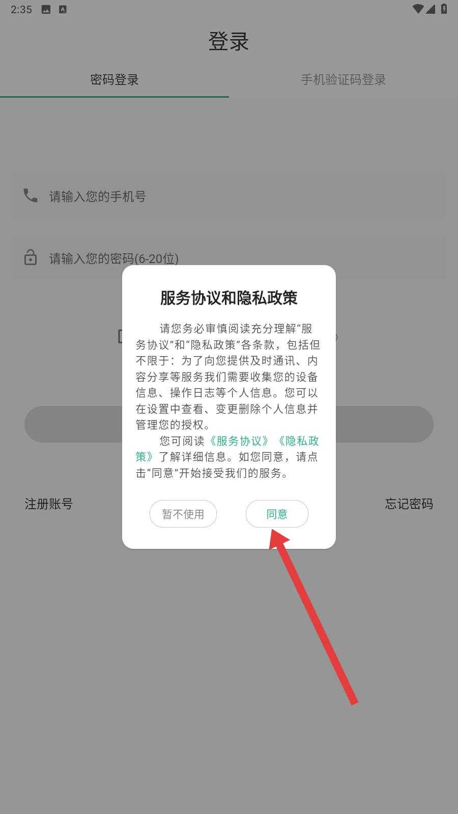 1、打开应用,弹出服务协议和隐私政策弹窗,仔细阅读内容后点击同意,回到登录页面。