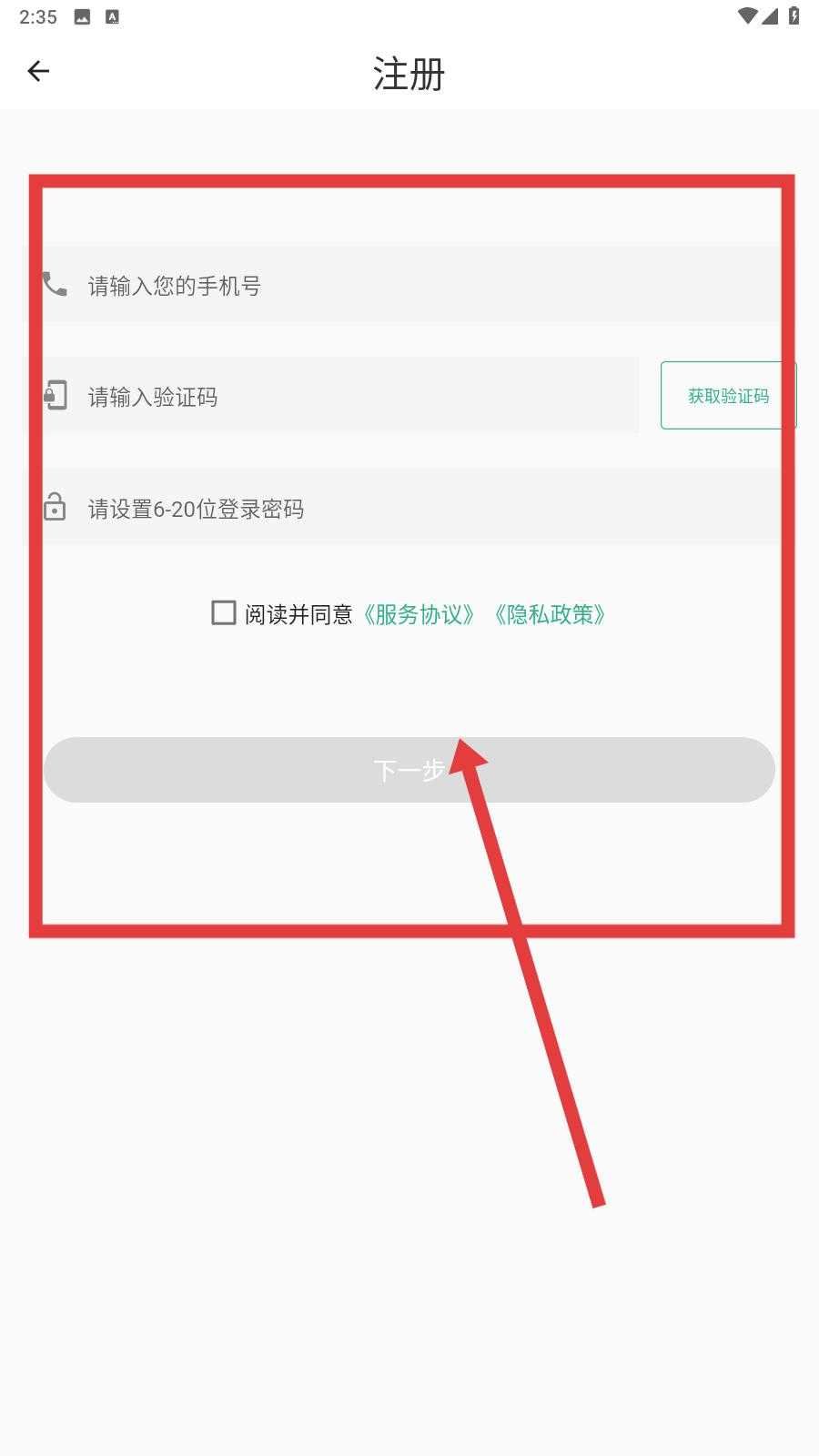 3、在注册页面,依次填写手机号,点击获取验证码并填入收到的验证码,勾选阅读并同意服务协议选项,确认信息无误后点击下一步,完成注册。