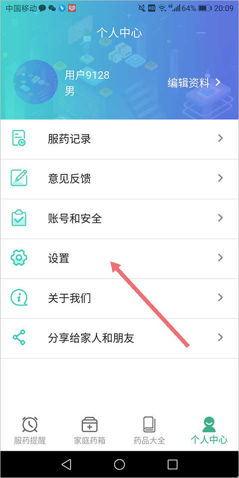 1、打开并登录吃药啦APP,点击底部导航区中的【个人中心】,在打开的新页面中点击【设置】