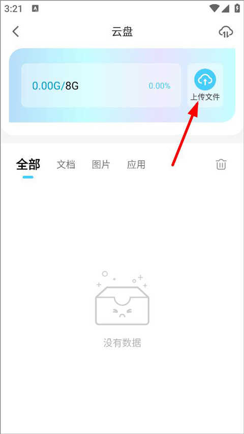 3、进入云盘页面点击上传文件按钮,进入添加文件页面,选择“应用”,勾选本地未安装需上传的APK文件;