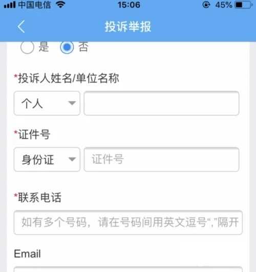 5.选择完毕后,在投诉举报界面填写个人投诉信息,点击下一步。