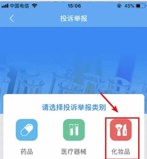 4.点击后在投诉举报类别中,选择化妆品的图标,进入到投诉界面。