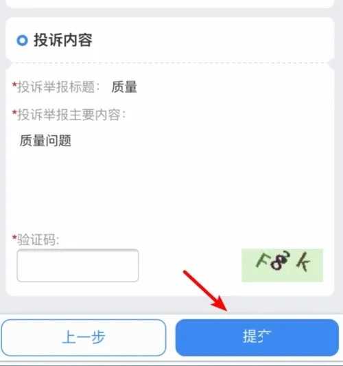 8.点击后可以看到整个投诉举报的内容信息,核实无误后,输入下方的验证码,点击提交即可提交投诉举报。