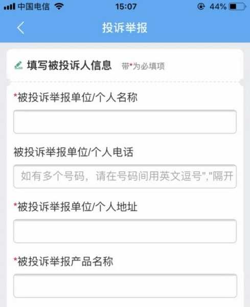 6.点击后,填写被投诉人的信息,比如举报的单位、地址、产品等,填写完毕后点击下一步。