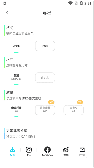 5、然后点击右上角的按钮即可对擦除后的照片进行保存,且可以自由选择保存的格式、尺寸、质量等等,也能直接进行分享;