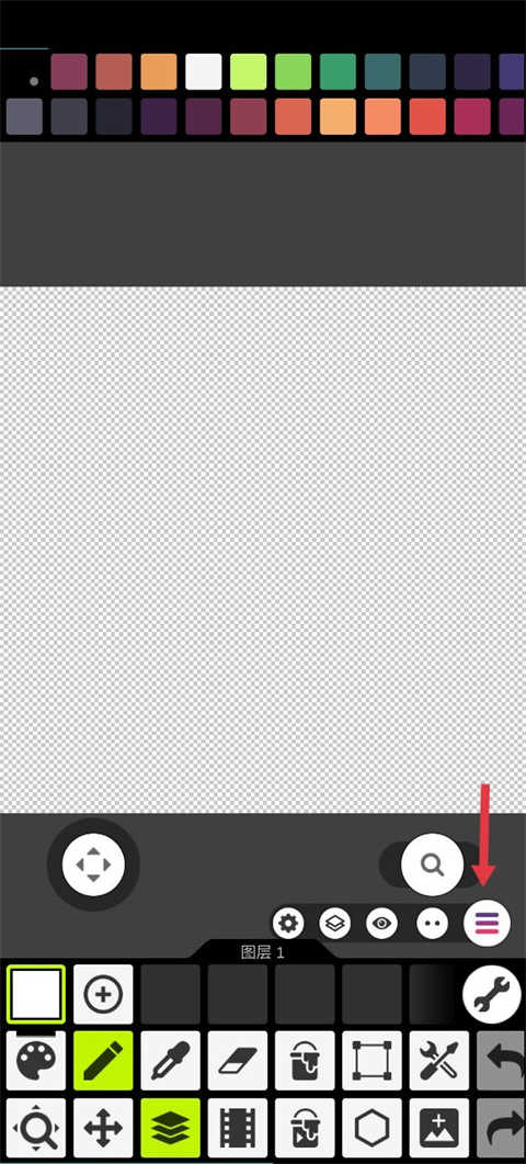 3、如果把图层和动画功能打开,我们会发现有四个设置:动画栏右侧的动画设置、菜单按钮左侧的工具设置、图层栏右侧的图层设置、工具栏最下方的软件设置。记得要到对应的工具设置中寻找想要的功能。比如说我想要删除图层们就要去图层设置中找,我想要调整动画速度,我就要去动画设置里找。