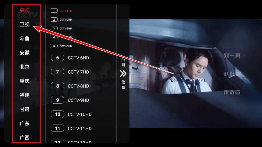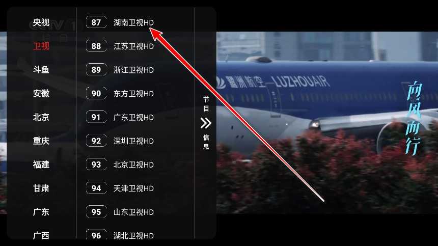 3. 在卫视分类下选择具体的卫视频道,即可完成切换