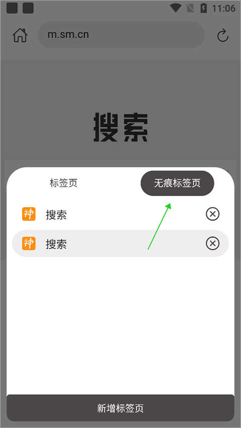 接着在弹出的面板中切换至无痕标签页后点击底部【新建标签页】即可开启无痕模式