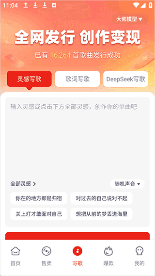 1、用户打开登录小元音乐圈ai写歌赚钱软件后首先在写歌界面中进行ai音乐创作