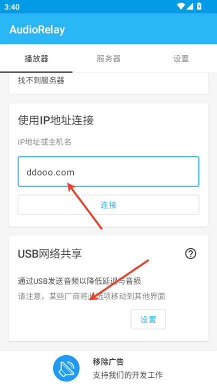 2、在播放器的设置界面,通过IP地址连接或是USB网络共享的方式完成连接。