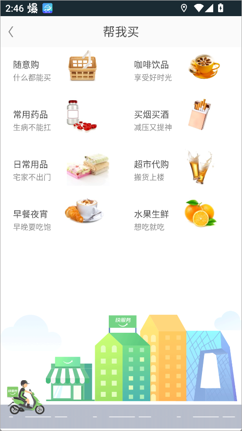 2、同城购物,提供同城各类商品和商家,在线立即选择代买,为你配送到家;