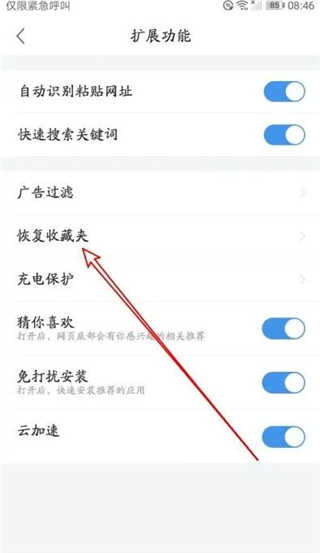 4、然后在打开的扩展功能页面中点击恢复收藏夹的设置菜单