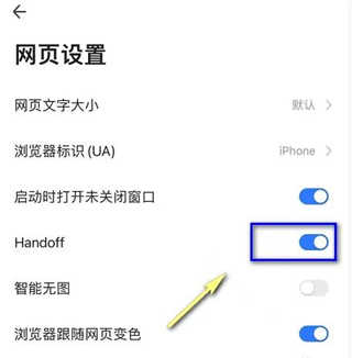 3、进入网页设置,将handoff后面的开关打开即可,如下图所示