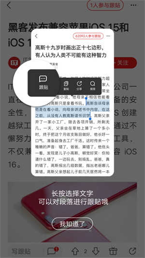 3、或者也可在文字内长按:选择文字,这样也可以对段落进行跟贴哦!