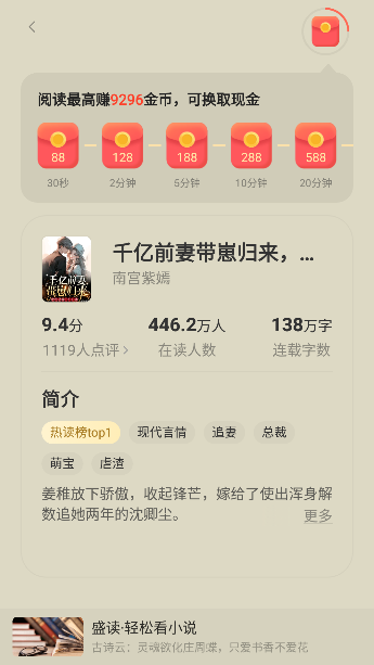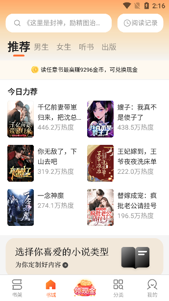 盛读是一款精品正版小说免费观看平台,大量的排行榜推荐,超多分类,能够给用户提供丰富的免费小说资源,涵盖了都市爽文、言情穿越、玄幻修仙、武侠世界等类型,基本上你想要的小说类型都可以在这里找到,同时还会更加你平时的阅读喜好和搜索习惯进行个性化推荐,每天都会给你推荐符合你口味的精品小说,让你根本不用担心找不到小说看。