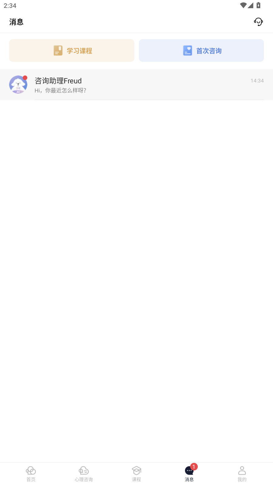 4、消息页面可以查看用户已经购入的课程和安排的咨询师消息情况。