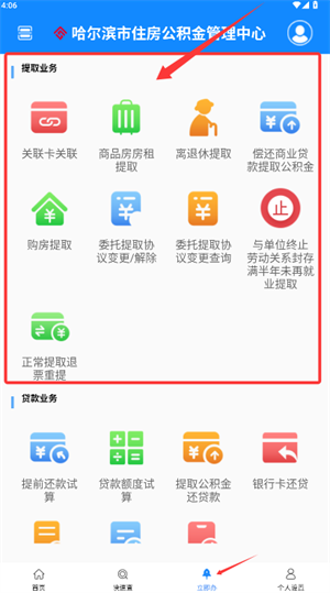 3、进入在线办理界面,支持关联卡绑定、租房提取及贷款申请等业务操作。