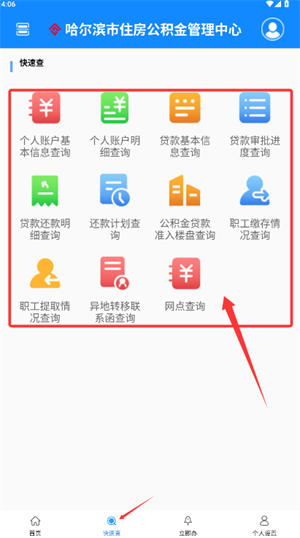 2、其中快速查功能最为实用,包含了个人账户基本信息查询、个人账户明细查询、贷款基本信息查询、贷款审批进度查询等等,方便用户查询自己的信息;