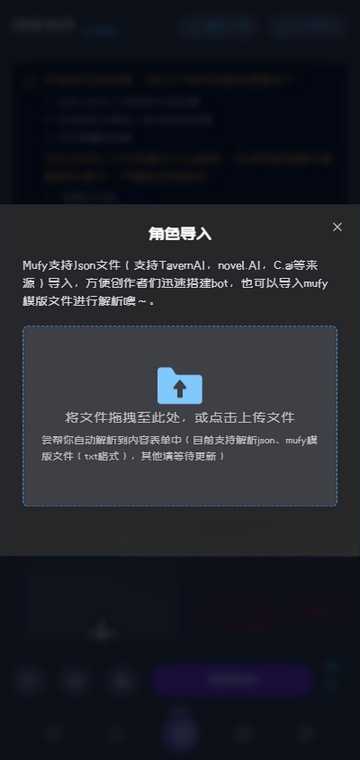 Mufy支持Json文件(支持TavernAl、novel.Al、C.ai等来源)导入,方便创作者们迅速搭建bot,也可以导入mufy模版文件进行解析噢。