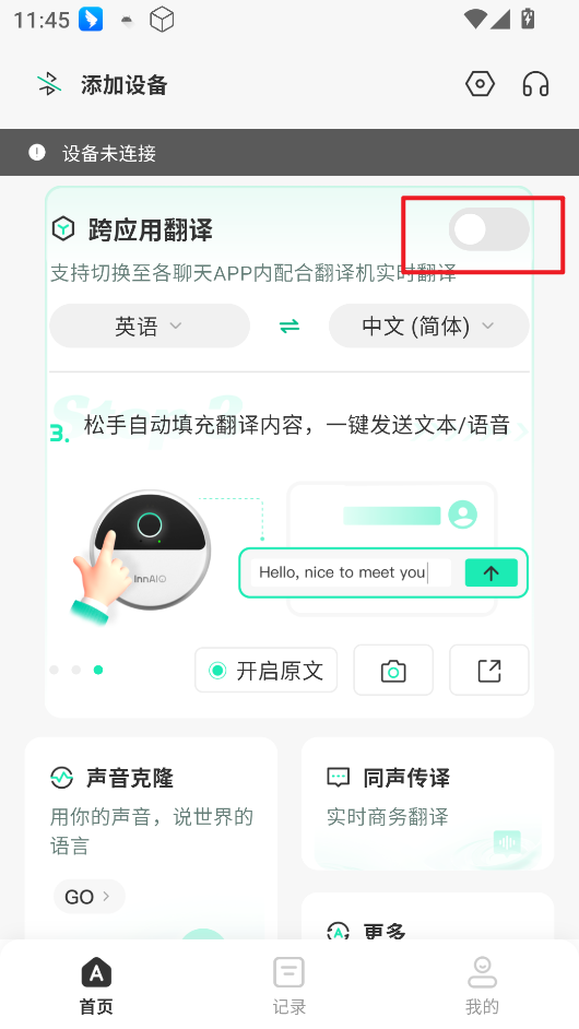3、首页可开启跨应用翻译,可切换至各聊天app使用。
