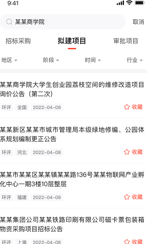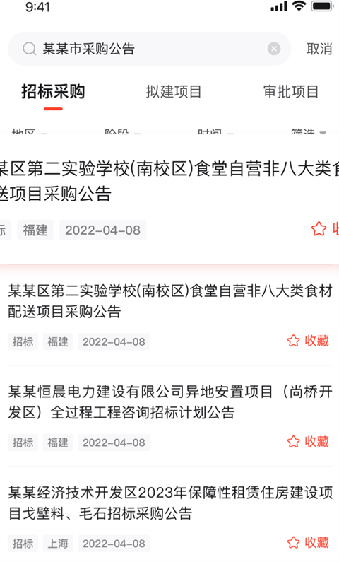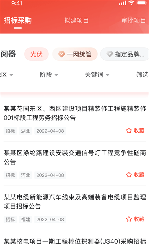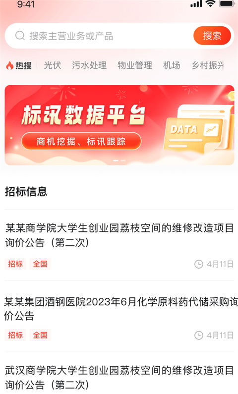 2、查看全国各地招标公告、预告、中标、变更、采购等信息;