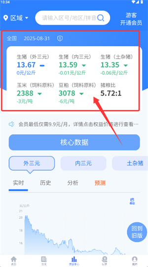 2、进入数据中心模块,可查询各地生猪品种及饲料原料的详细报价信息。