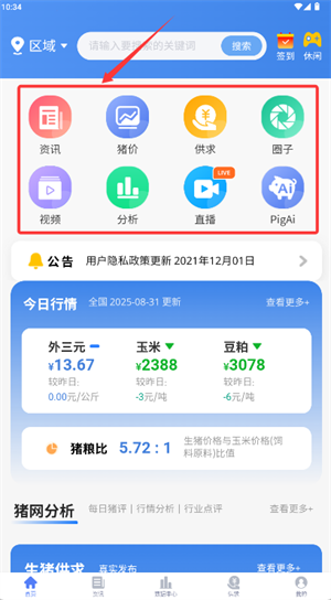 1、首页:集成资讯、猪价、供求、圈子、分析、百科等一众实用快捷工具;