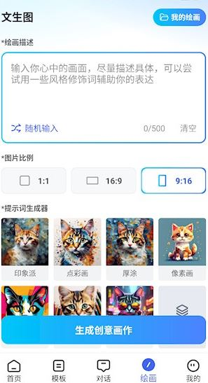 2.进入文生图界面后输入绘画描述,选择图片比例,点击生成创意化作即可