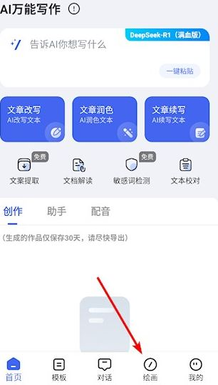 1.打开AI万能写作,进入首页后点击下方的绘画