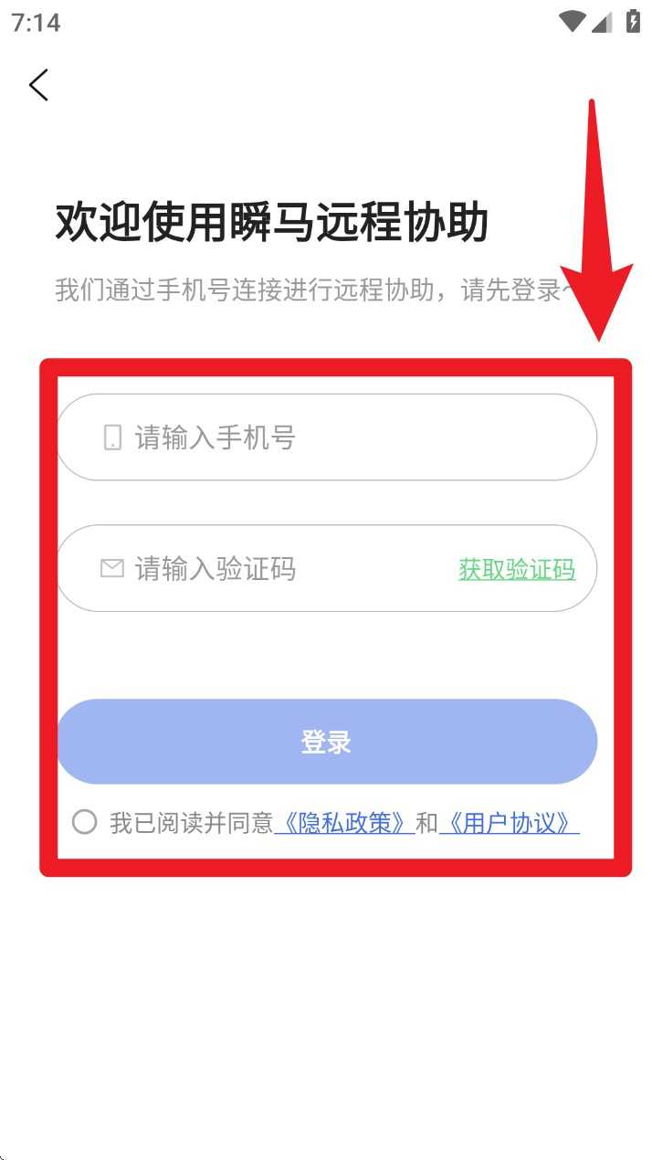 1. 打开 App 后输入手机号码并获取验证码,勾选协议后点击登录进入主界面。