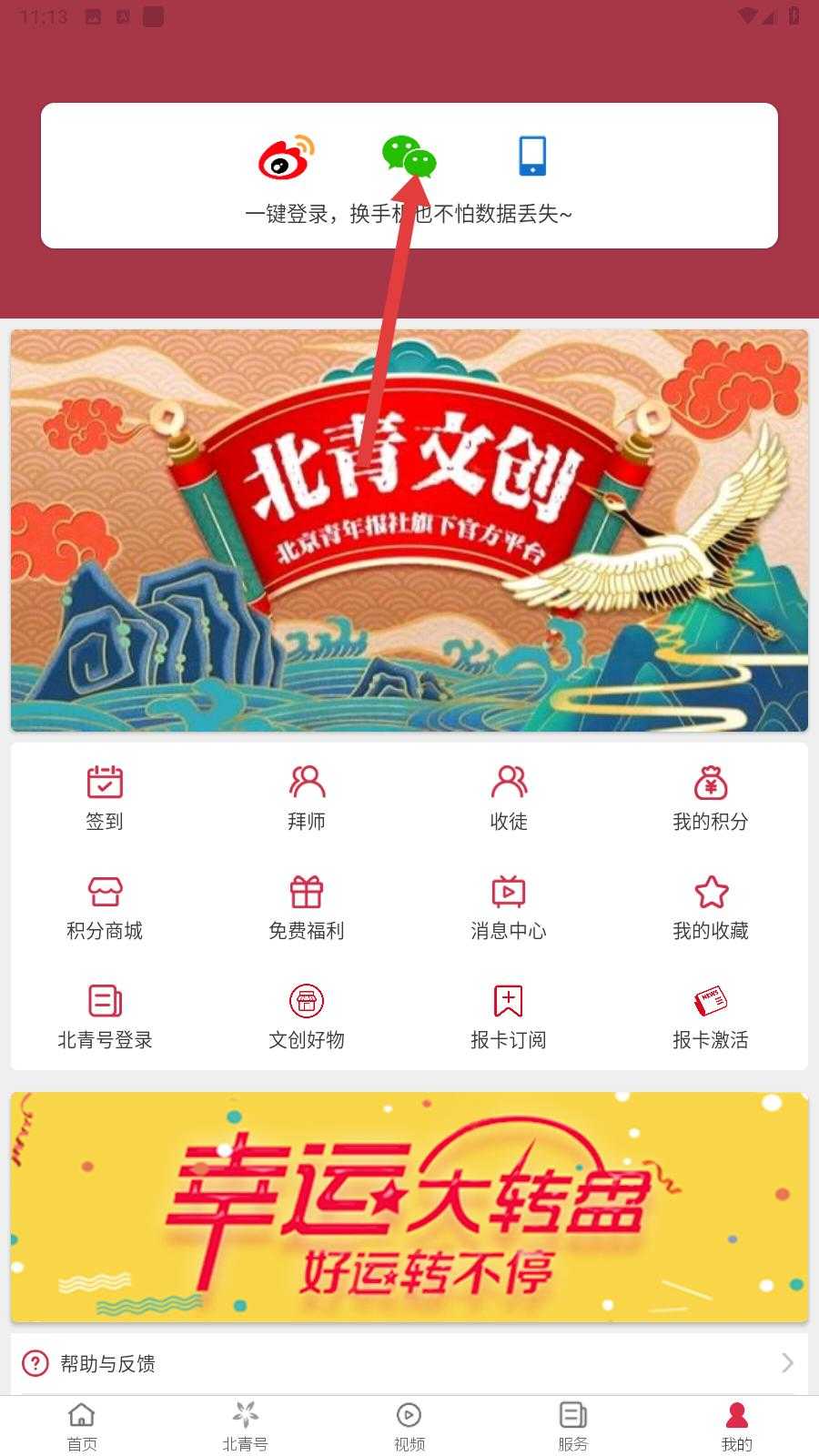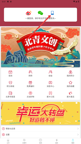 2、登录成功后,进入APP首页,能看到北青文创等板块,还有签到、摇奖等功能入口,可参与相关活动。