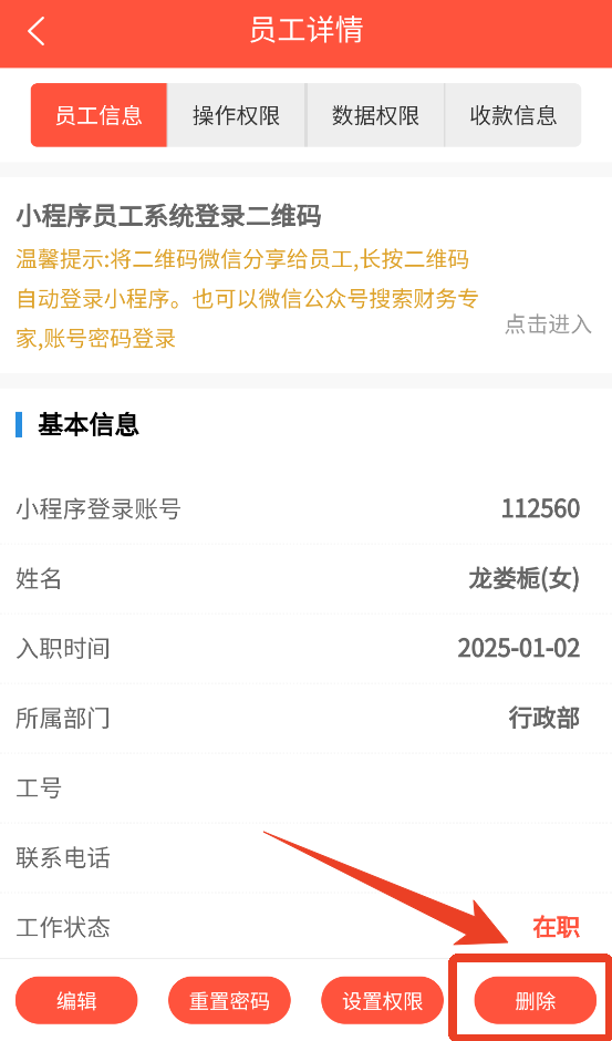 3、想删除的话,点击需要删除的员工,在底下有【删除】选项,点击即可。